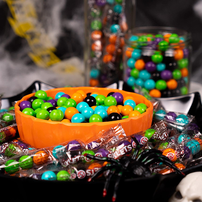Large laydown bag with 151 single six‑ball tubes, perfect for Halloween trick‑or‑treating. Gluten‑free, kosher, halal, and produced in a nut‑free facility, this festive bulk pack delivers bright orange, purple, teal, and black Sixlets for spooky celebrations.